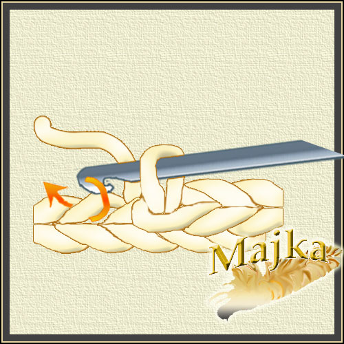 Wkłuwamy szydełko w oczko, nabieramy nitkę, przeciągamy przez oczko.