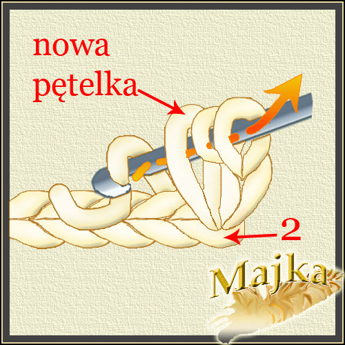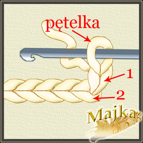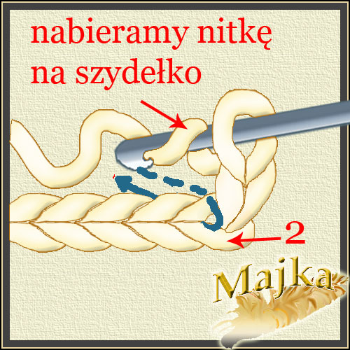 Wkłuwamy szydełko w drugie oczko (na rys. oznaczone nr.2) łańcuszka lub wcześniejszego rzędu i przeciągamy przez nie nitkę.