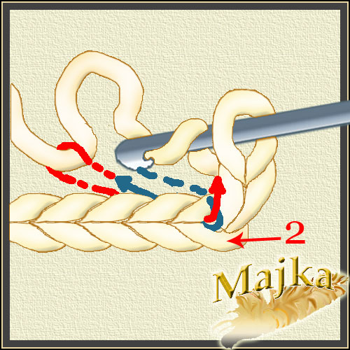 Szydełko wkłuwamy od przodu ( niebieska linia ). Szydełko wraca z nitką i przeciaga ją przez oczko ( czerwona linia ).