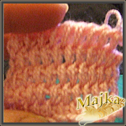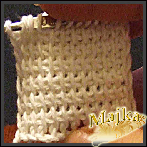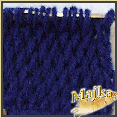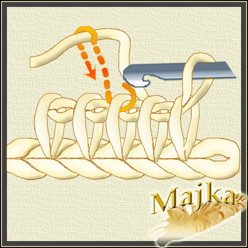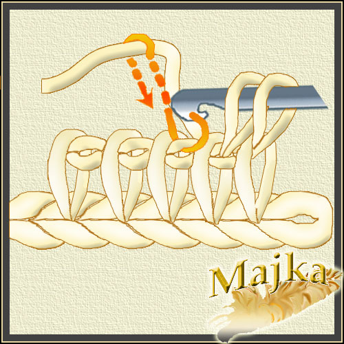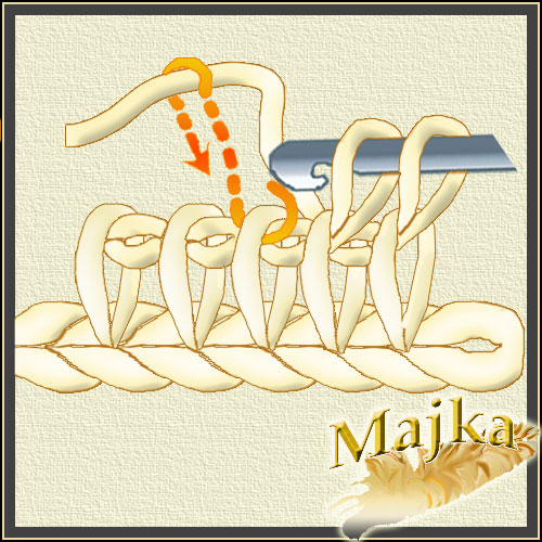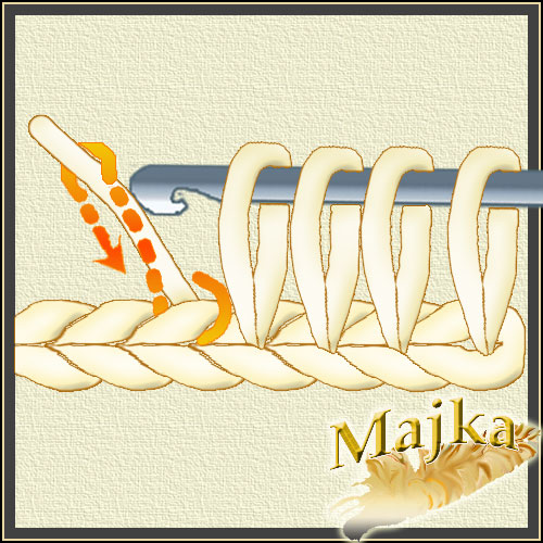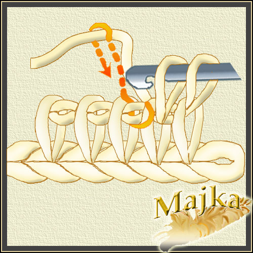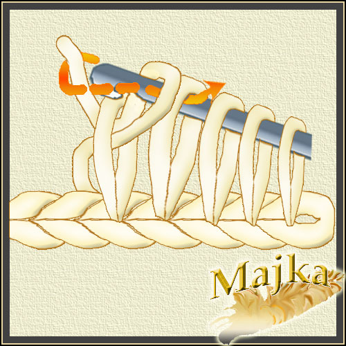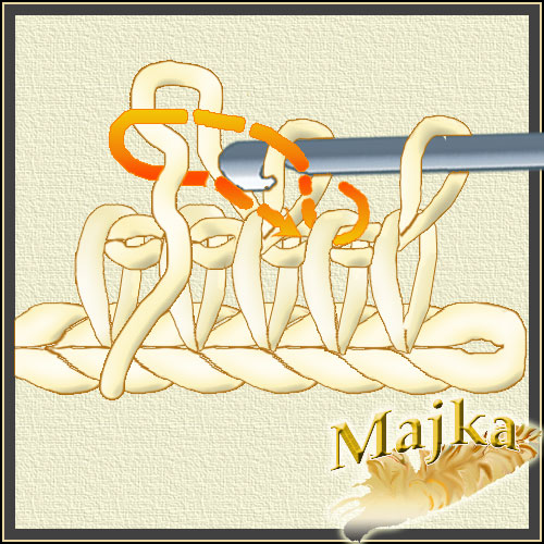 Nabieramy pętelkę przeciągając nitkę pod pętelką poprzedniego rzędu, tyle ze opuszczamy pierwszą i nabieramy pod drugą a potem wracamy do tej opuszczonej i pod nią też pobieramy nitkę. Uzyskujemy skrzyżowane pętelki