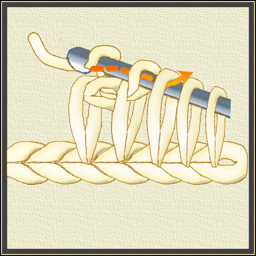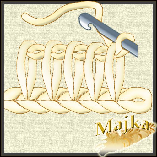 Na szydełko nabieramy nowe pętelki, przeciągając nitkę przez oczko łańcuszka rzędu powrotnego.