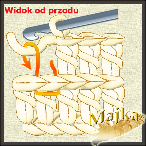 Wbijamy szydełko i przeciągamy nitkę wokół słupka z poprzedniego rzędu. Reszta jest uzależniona od tego czy słupki są pojedyncze, podwójne czy inne.