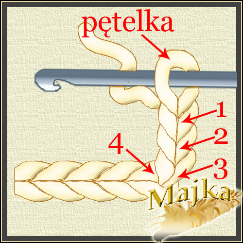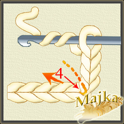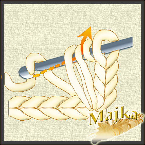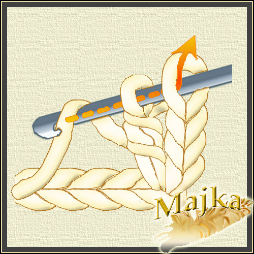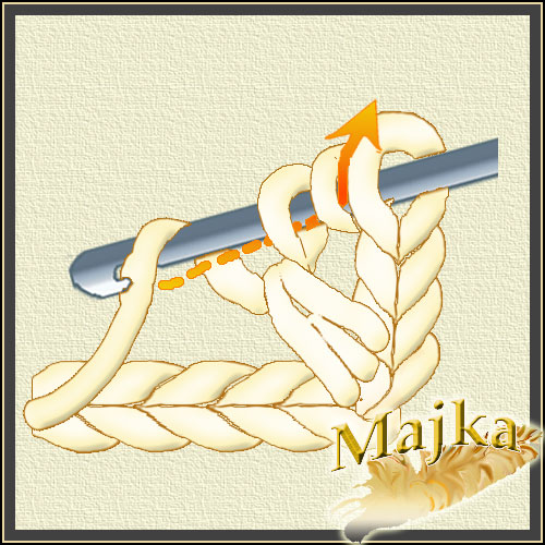 Znowu nabieramy nitkę na szydełko i przeciągamy ją przez obie pętelki znajdujące się na szydełku.