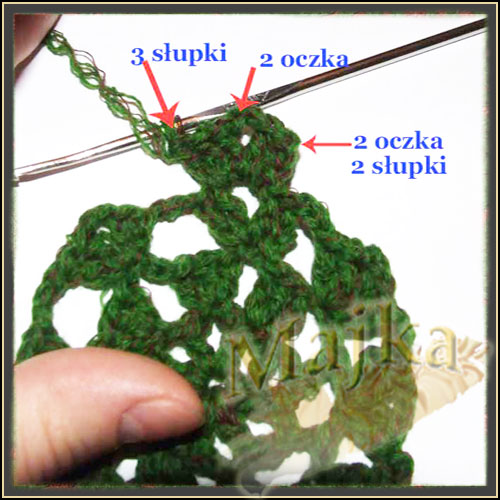 Wkłuwamy się w nie i robimy 2o (zamiast pierwszego słupka), 1s, 2o, 2s.