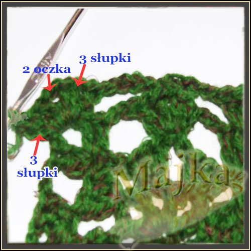 Wkłuwamy się w nie i robimy 2o (zamiast pierwszego słupka) i 2s. Potem 3o odstępu i znowu wkłuwamy się w 2o odstępu w poprzednim rzędzie 3s, 3o odstępu itd...